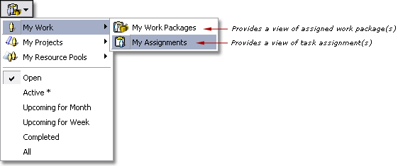 Timesheet filters are also available to help users produce the view that best suits their immediate needs. PMOffice™ recognizes that project resources will yield different levels of responsibility, and as such, will require additional filtering levels. The timesheet views provided within PMOffice™ are based on a three-tiered structure, contoured by resource responsibility and security access. These three filter categories are defined as: My Work, My Projects, and My Resource Pools. My Work Filter |